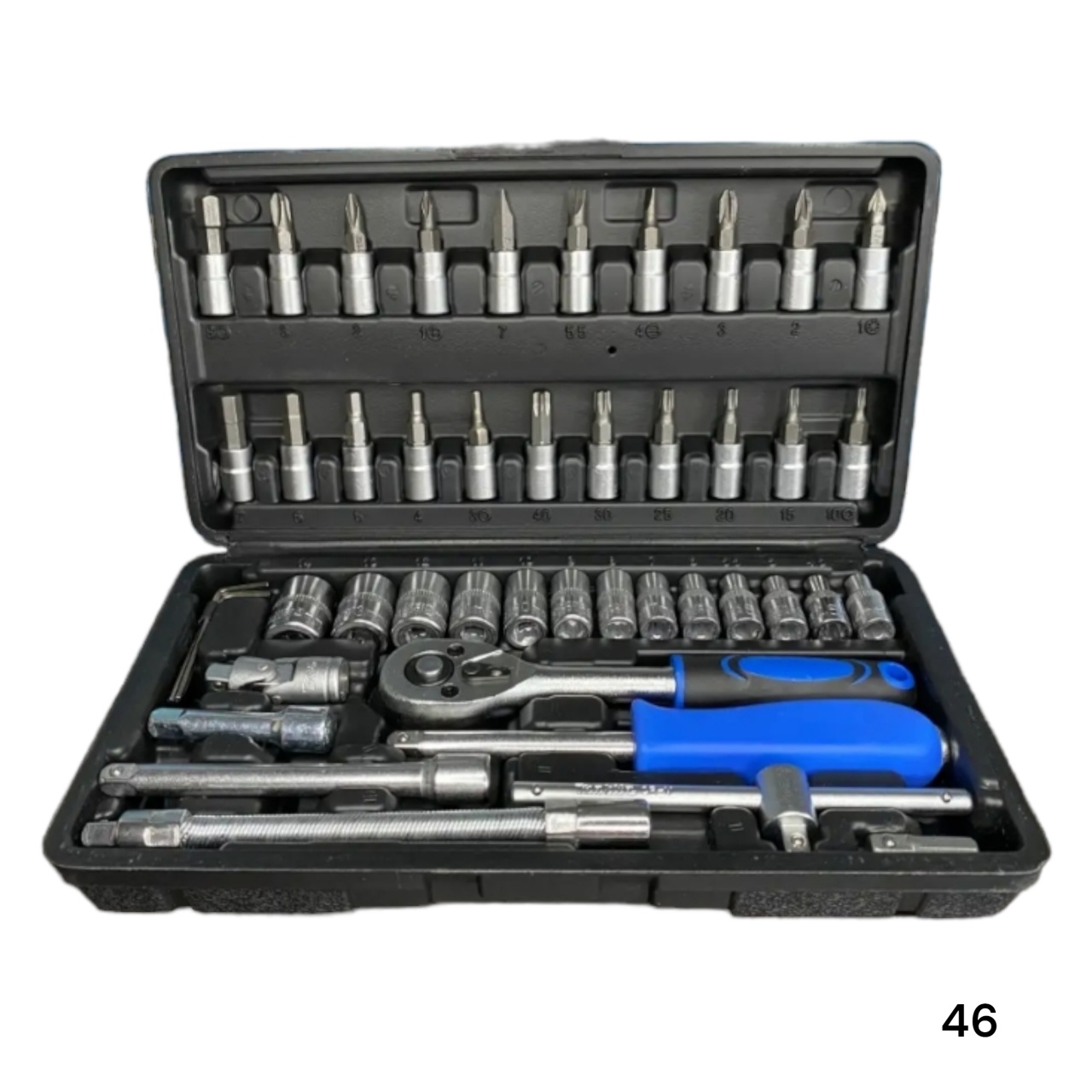 Набор инструментов для авто 46 предметов предназначен для обслуживания автомобилей, а также отлично подойдет для проведения ремонта бытовой и садовой техники. Инструменты для ремонта автомобиля 46шт. поставляются в удобном пластиковом кейсе с застежками. Все инструменты выполнены из стали со специальным покрытием из хром ванадия. Место для каждого элемента подписано, а детали набора промаркированы. Трещотка с обратным реверсом дополнена удобной двухкомпонентной рукояткой.