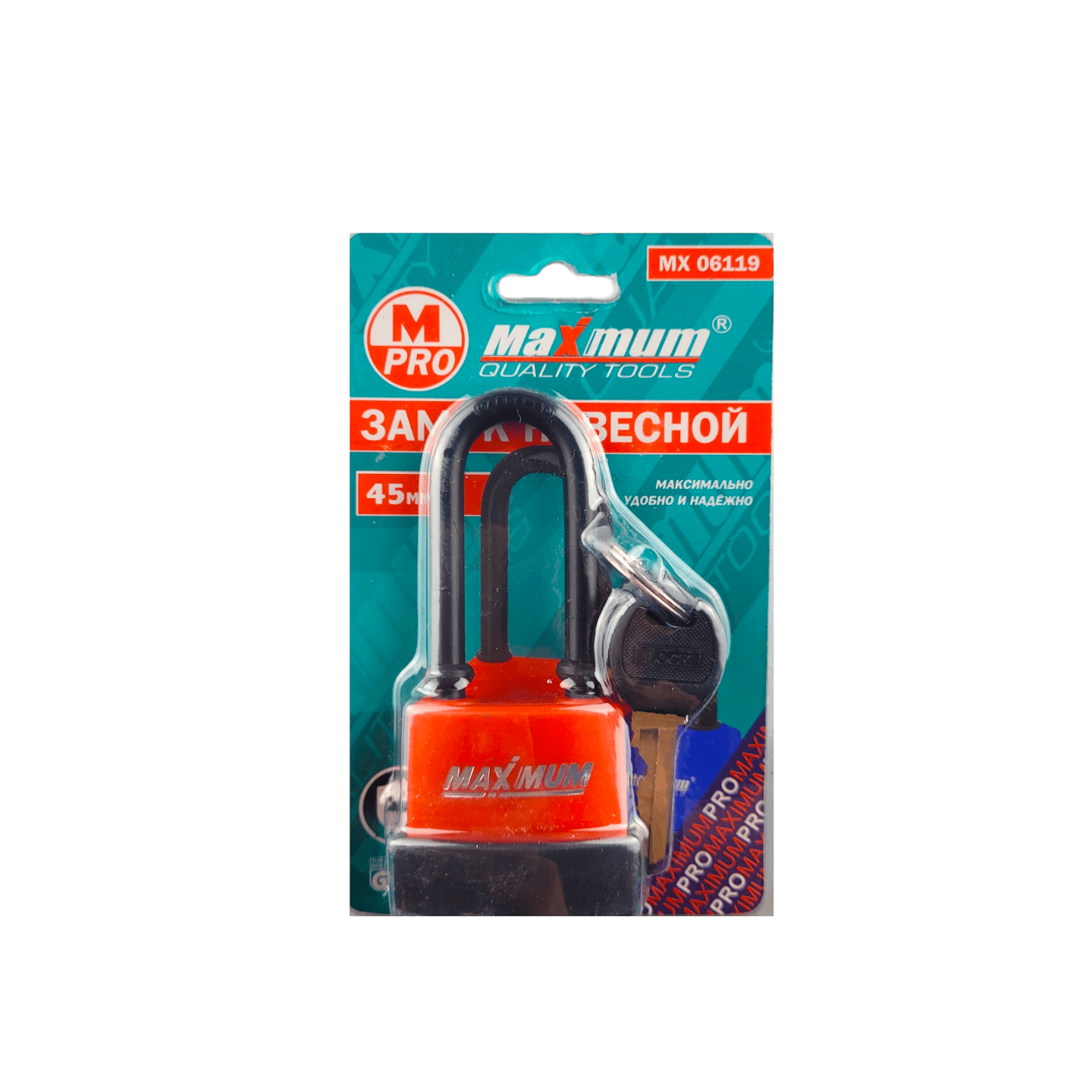 Всепогодный замок навесной 45 мм "MAXIMUM QUALITY TOOLS" создан со специальным длинным ушком толщиной 6 мм.