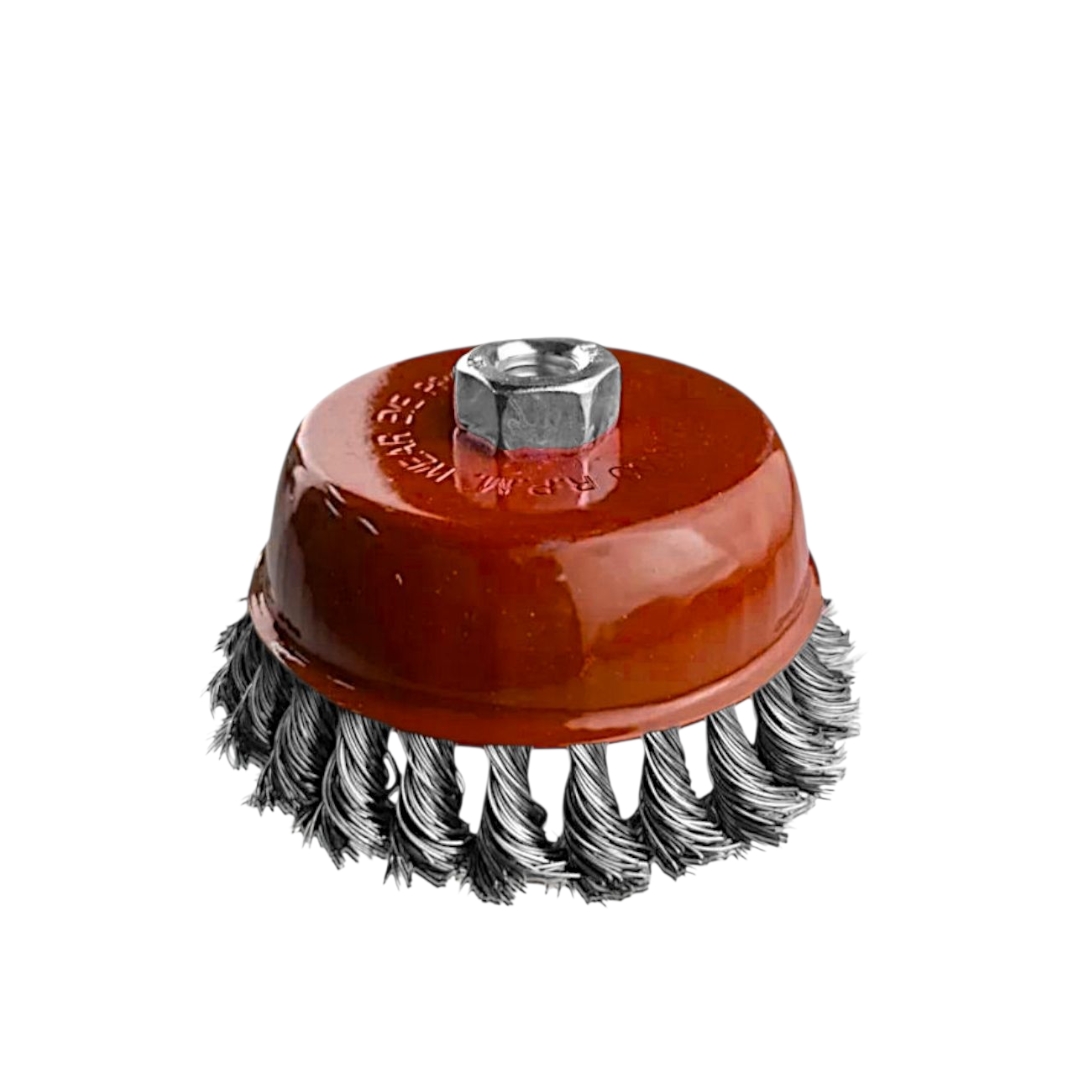 Чашечная щетка является сменным элементом для угловых шлифовальных машин. Применяется для шлифовки, полирования, зачистки от лака, краски и коррозии различных поверхностей и изделий. Рабочая часть состоит из скрученной в пучки стальной, закаленной проволоки.