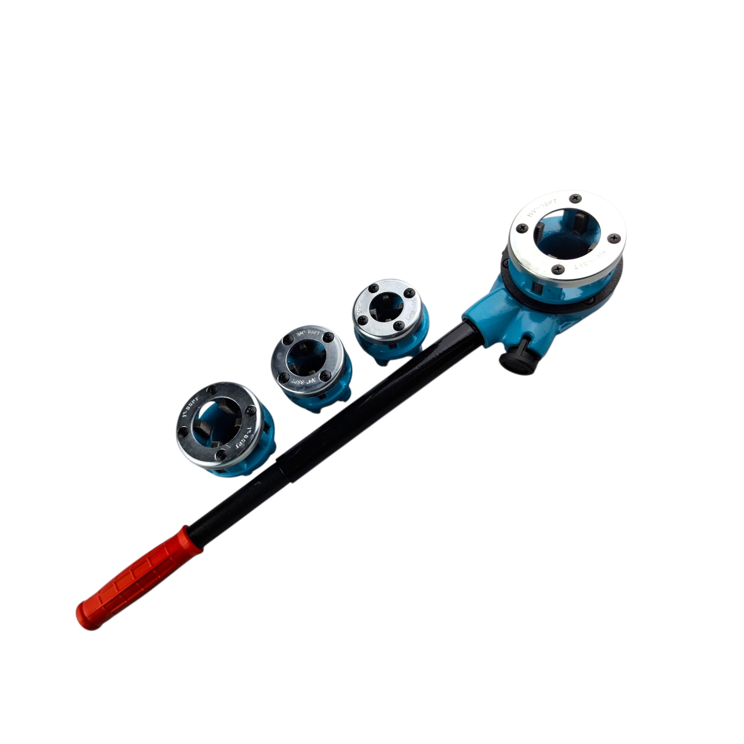 Каждая резьбонарезная головка имеет четыре отверстия для удаления стружки. Длинная ручка обеспечивает максимальное кручение при нарезании резьбы. Набор поставляется с пластиковой коробкой, что позволяет удобно транспортировать и хранить инструменты. Головки для нарезания резьбы изготовлены из чугуна, прочного и износостойкого. Резьбовая плашка: 1/2", 3/4", 1", 1-1/4" Тип резьбы: цилиндрическая трубная резьба 55 °.